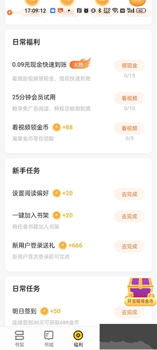 2、点击中间下方的福利按钮,即可每日签到领取金币,金币可以兑换成零钱提现;