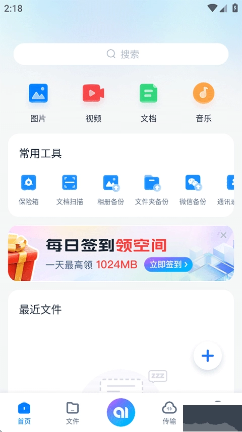 1、打开360AI云盘,在首页的常用工具下提供了文档扫描、相册备份、文件夹备份等功能;