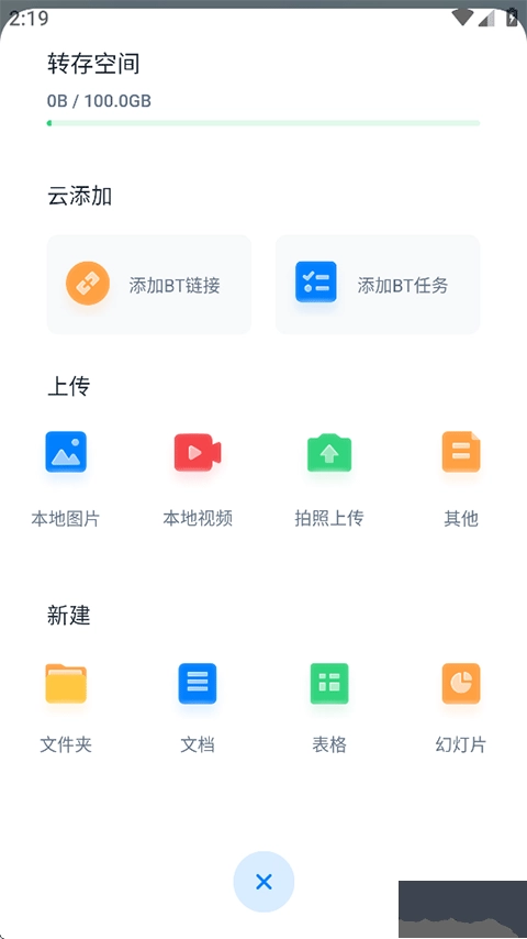 2、点击首页右下角的+按钮,您可以在此处将图片、视频、文档上传至云盘,也能在云盘里新建文件夹、文档、表格以及幻灯片等文件。