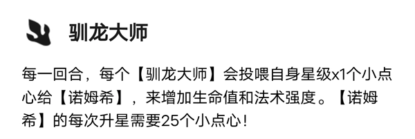 这个羁绊也算是我玩了几个赛季比较特殊的了,凑齐驯龙大师的羁绊会召唤出一个诺姆希,诺姆希每回合会被投喂点心。前期有诺姆希就可以多一个前排,前期过度首选。凑出3驯龙诺姆希的技能造成额外100%的伤害!