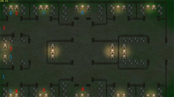 这一关是秦用的死劫关卡。我军的行动限制为只能在民居上行走,并且每首次进入一个民居,都会在周边民居触发强制出现的刺客;一旦刺客抵达红线位置,就会引发一波伏兵,伏兵配置为两个步兵、两个枪兵和两个弓兵。另外,蓝框区域内若人数超过三人,同样会触发两个强制出现的刺客。需注意的是,若同时触发4波及以上伏兵,秦用会触发中伏剧情;要是14回合内未主动进入瓮城,也会自动触发该剧情。