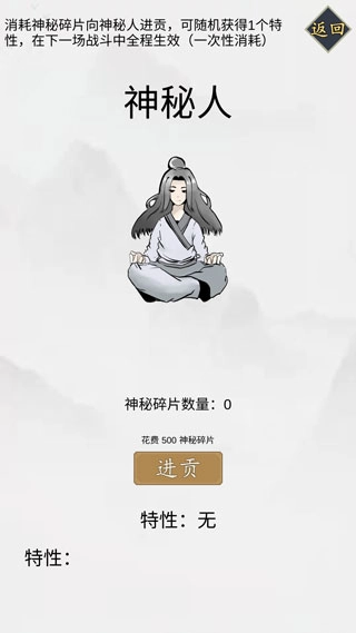1、点击休息处,可前往仙玉商店选购各类成长天赋 2、点击神秘人,能在此处进行进贡,获取不同特性