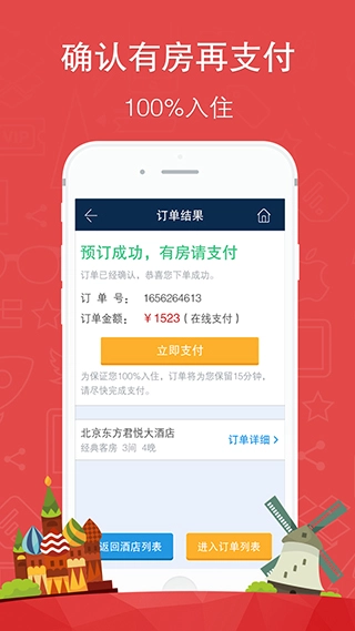 100%有房,线上订房能够在确保有房的情况下才支付;