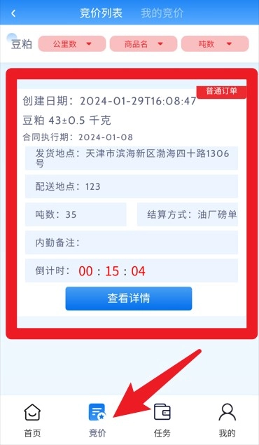3.点击底部导航栏竞价按钮,进入竞价列表,查看各项竞价详细信息。