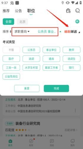 2、其中我们可选择“求职意向”或考试类型,对各个岗位进行简单筛选;除此之外,也可点击“编制筛选”来精准锁定目标岗位。