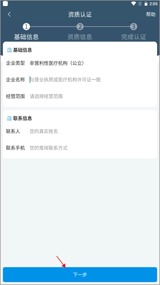 3、填写企业的基础信息及联系人信息,再点击下一步。