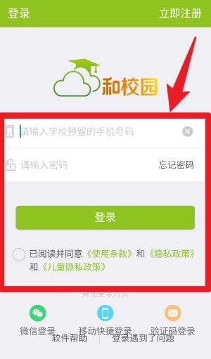 1、打开后进入登录页面,输入学校预留的手机号及密码,勾选协议后点击登录即可。