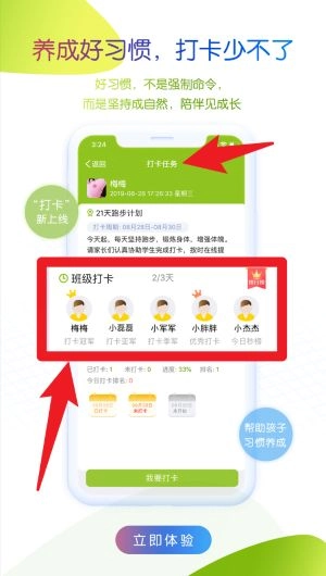 3、登录成功后可进入打卡任务页面,查看孩子打卡计划与完成情况,并鼓励持续打卡。