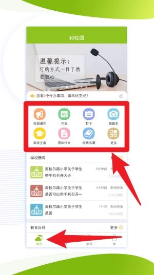 4、在首页可看到校园通知、作业、错题本等功能图标,点击对应图标即可进入相应功能模块。