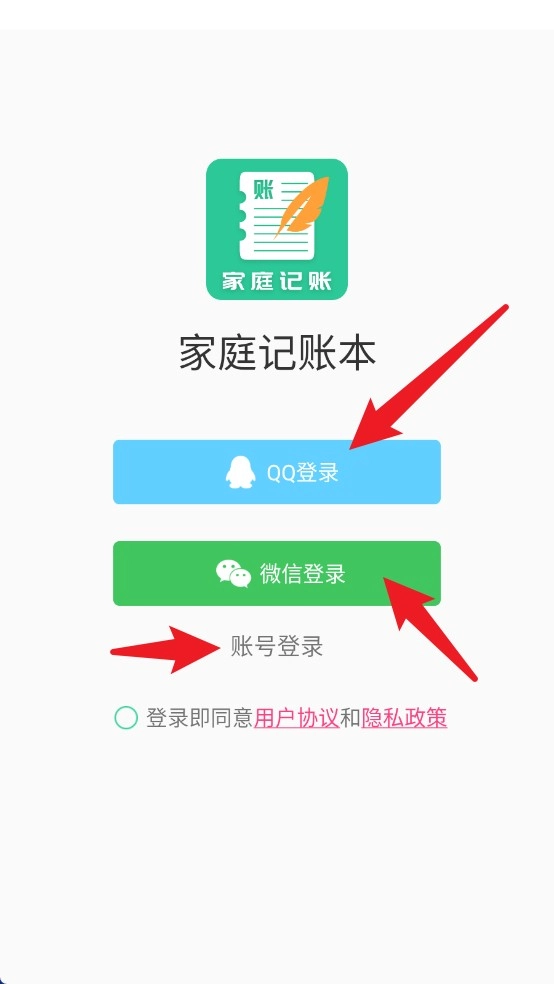 1、登录界面支持微信、账号登录两种方式,方便用户快速进入家庭记账本。