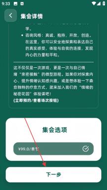 3、在集会详情页点击【下一步】,进入支付选择页面。