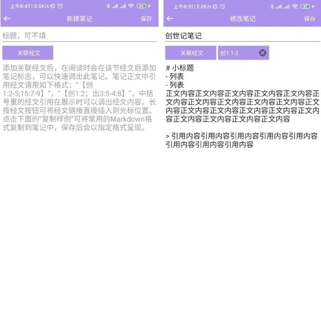 编辑多条笔记,同一章的笔记会显示在同一页,按照关联经文的顺序进行排列。在【所有笔记】页面可以查看所有笔记,【所有笔记】中的内容按照添加时间排列。