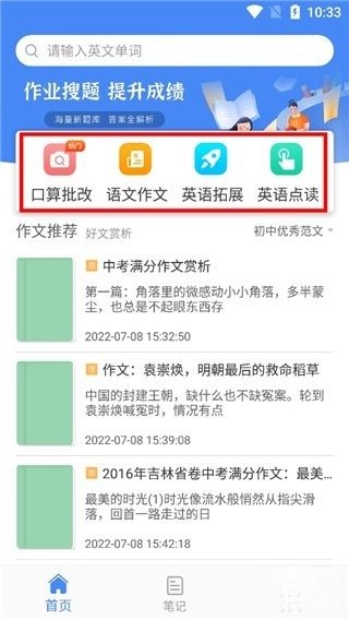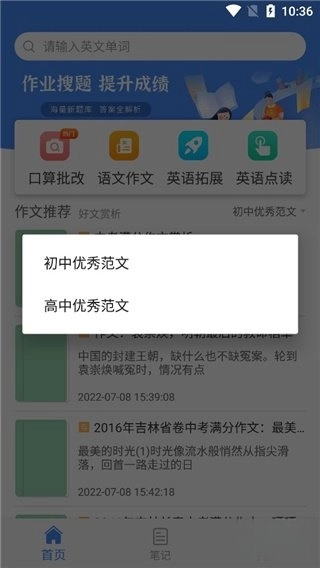 7、回到上一级页面后,能看到首页推荐了不少作文,并且支持自由切换初中和高中的优秀范文。