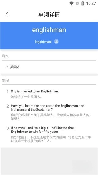 3、点击查询的单词,即可查看该单词的详细信息,包括释义和例句等。