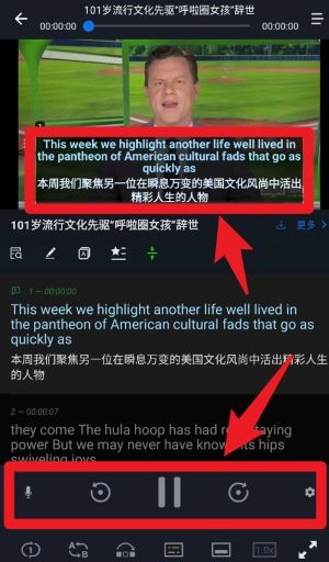 3、在视频播放界面中,用户能够同步查看英文字幕和对应的中文翻译内容,界面下方的工具栏还提供了暂停播放、调整语速等有助于编辑操作的辅助功能。