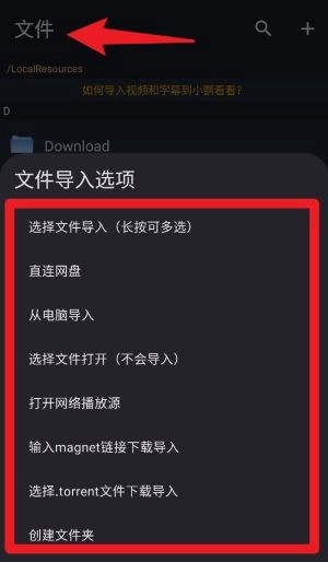 4、点选文件页签后,点击右上方加号会弹出文件导入选项,支持从网盘、链接等多种方式导入视频资源。