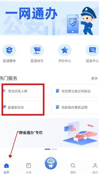 1、打开软件,在首页热门服务,可以进行备案机动车、无犯罪记录证明核验等多种服务;
