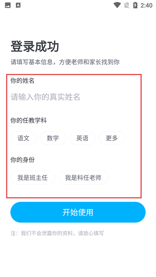 3、登录成功后,需填写【真实姓名】,选择【任教学科】与【身份】(班主任/科任老师),确认无误后点击【开始使用】。