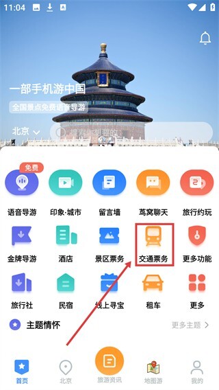 1、进入首页后,点击【交通票务】进入对应服务页面。