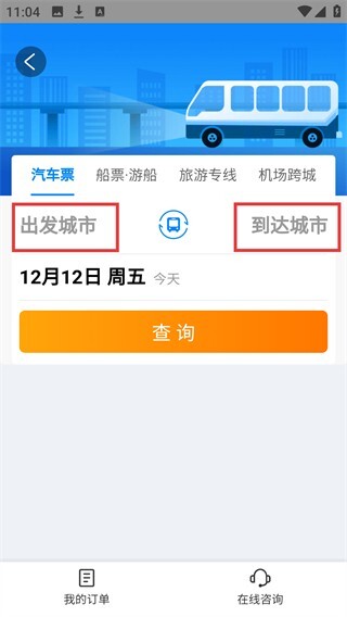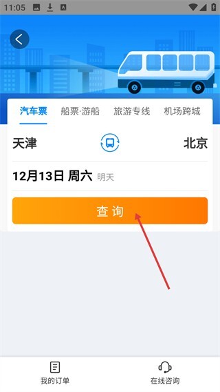 3、进入【汽车票】页面后,填写出发城市与到达城市,选定出行日期,随后点击【查询】按钮,即可获取相关车次信息。