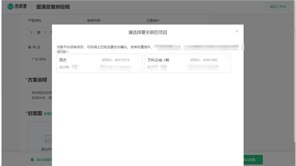 2、投稿界面页面方案信息有关联项目点击。