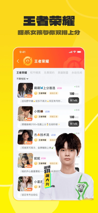 在这里可以约玩热门网游,和技术高超的游戏玩家组队开黑,一起冲击超神时刻。