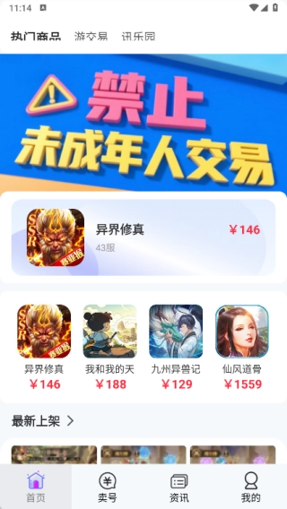 1、在首页中提供热门商品、游交易及讯乐园版块,同时了解最新上架的游戏账号;