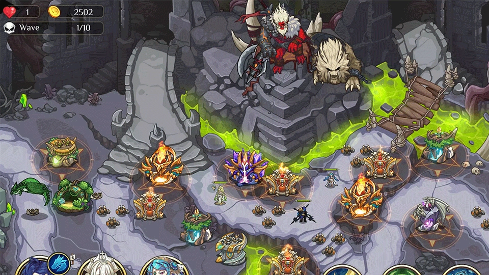 2、丰富多样的防御塔种类:涵盖兵营、魔法塔、炮塔、弓箭塔等,每种防御塔都具备独立的升级系统以及独特的进化展示效果。