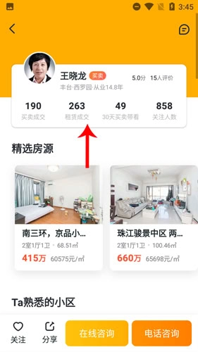 3、正中央显示经纪人的成交量。