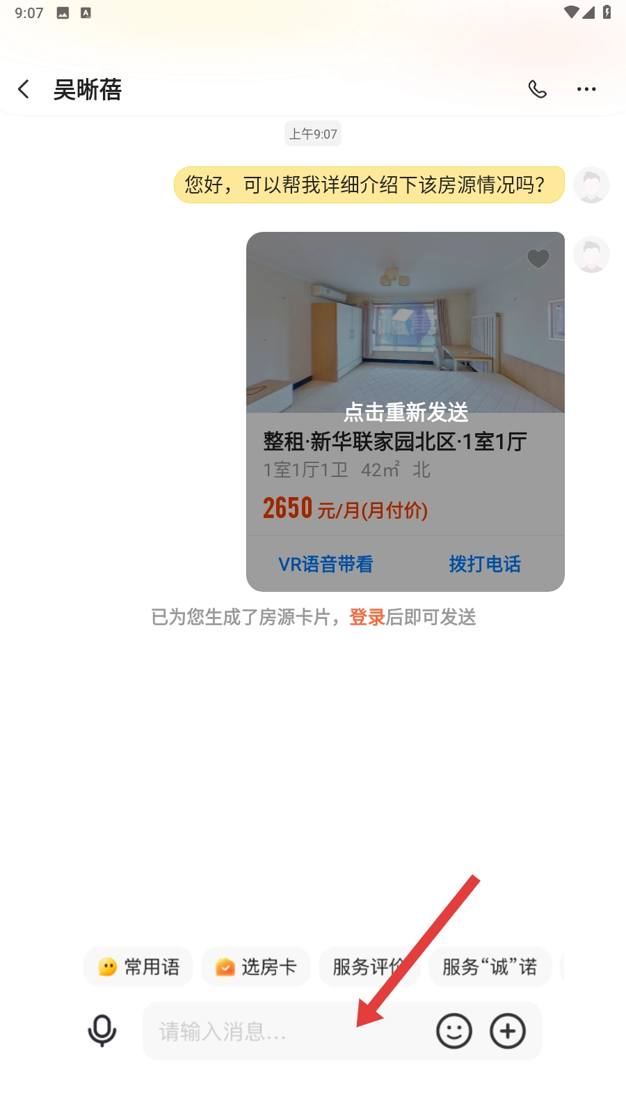 4、在聊天界面,你可以在输入框里输入消息,和经纪人深入沟通房源的具体细节,还能发送房源卡片,让租房咨询的过程更加顺畅。