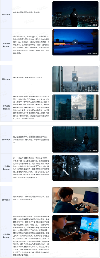 下面的示例展示了增加【镜头时序】和【镜头运动带来的画面变化】描述所带来的结果。