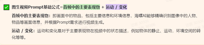 图生视频所采用的图片会作为视频首帧呈现,这就框定了视频主体物的形象以及基本的画面美学风格,所以和文生视频Prompt相比,图生视频Prompt的信息量能够适当精简一些。