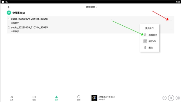 2、本地音乐完成自动识别加载后,找到目标歌曲右侧的三点图标(如红色箭头所指位置),点击后选择【加到歌单】选项(绿色箭头标注处)即可完成收藏,此外也能直接点击歌曲进行播放。