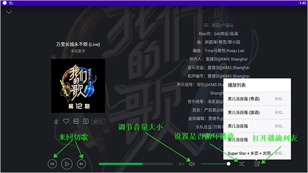 6、借助底部工具栏,能够快速完成切歌、音量调节、打开播放列表等操作