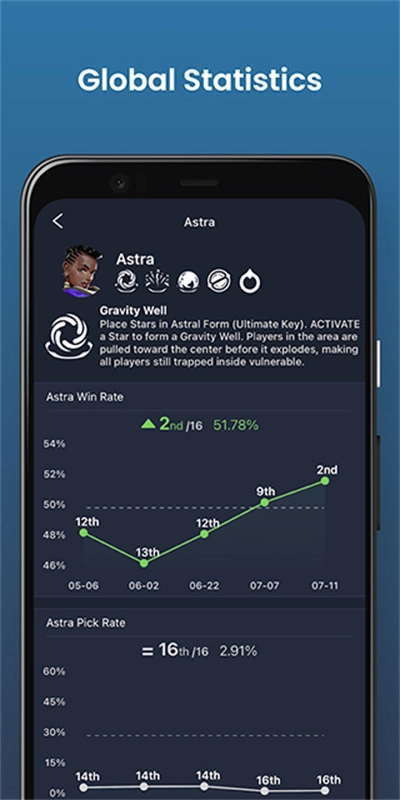 您可以查看任意地图或排行榜上每个Valorant特工的全球洞察数据,比如各自的胜率;还能详细了解他们的统计信息,包括逐步上升的KDA或选择率等内容。