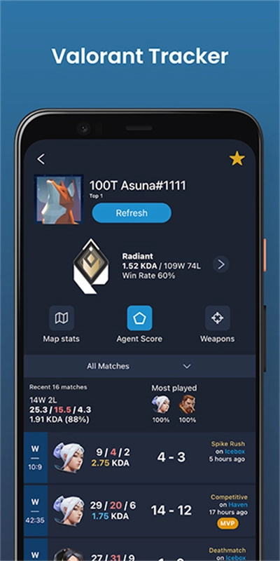 您能够查看所有公开个人资料的Valorant玩家数据。把他们添加到收藏夹后,就能查看其洞察数据了。此外,您还可以获取以往任意一场比赛的统计数据与详细信息。