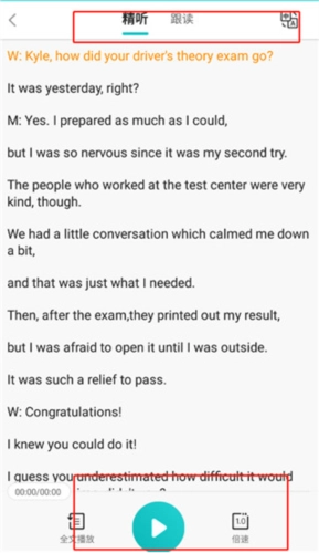 3、用户可自行选择精听或跟读模式。若选择精听,用户能够自主调节播放倍数,点击全文播放按钮即可开始收听。