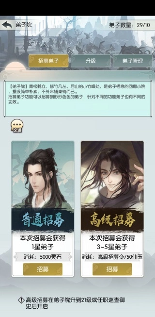 弟子院能从血脉层面提升你的实力,弟子品质最高为五星,四星及以上的弟子千万别丢弃,它们都有各自的用途。越早获得高星弟子,就能让其等级提升得更快。刚飞升时就能通过高级招募获取的御史大夫,能帮助你在前期抢占优势。有条件的玩家,可以考虑每天在暗金坊购买打折的高级弟子令,并且尽早使用。因为游戏中不会出现重复招募的情况,所以平民玩家也能显著提升弟子院的等级。举个例子,当你的弟子院等级达到40级时,可招募的弟子数量会大幅增加,此时你手中大约会有30个三星弟子,只需留出一个招募空位,下一次招募到的弟子最低品质就是四星,获得五星弟子的概率也很高。你可以根据弟子的天赋,安排他们去洞府增加资源收益、上阵提升战斗实力,或者派往禁地获取钱财。在弟子数量较少时,部分上阵弟子也能参与禁地任务,你可以考虑暂时将他们下阵,优先完成禁地任务。当禁地上阵4名弟子时,弟子的需求量会比较大,需要合理规划使用。