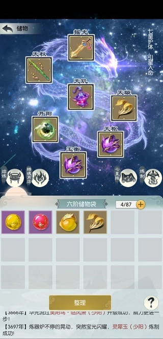 3:法器法宝目前版本,尽量成套使用。7种不同法器,加成也不少。要有规划,比如走火路线,那么其他内丹就可直接回收,省出不少空间,材料加七星阵,早加早收益。2级内丹昊阳鸟出自吞天塔,3级内丹可以在奇遇兑换里用幻尘石兑换。出处分开,不至于因为凑内丹,过分耽误其他发展规划。