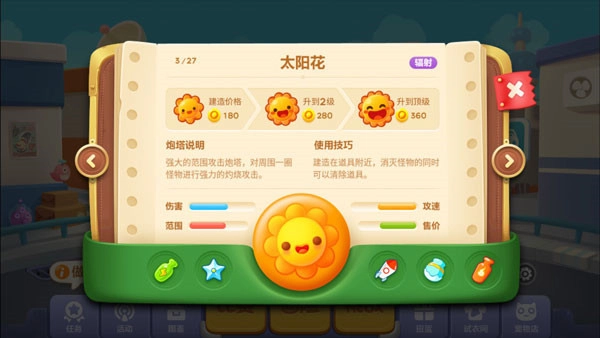 攻击效果:太阳花的技能是群伤效果,以自己为中心放射出一圈光芒,对小怪进行灼烧伤害。