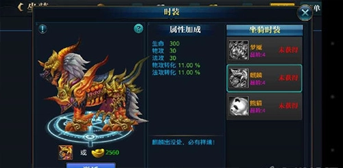 坐骑:坐骑战力的提升主要还是靠坐骑时装,55级的坐骑技能和60级以后的坐骑洗髓。时装的话第七天送梦魇,麒麟和熊猫就需要真金白银购买了。
