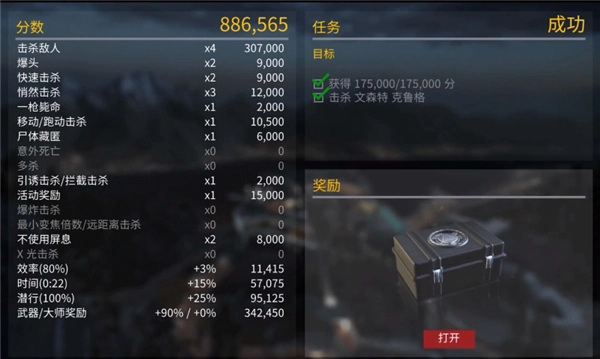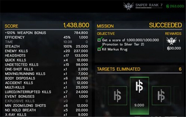 这是一个单纯用于刷分的关卡,建议使用分数加成最高的武器,通过连续的爆头击杀和秘密击杀来获取高分。下图展示了过关的分值构成,我使用的枪支是6级的NARCISSUS。