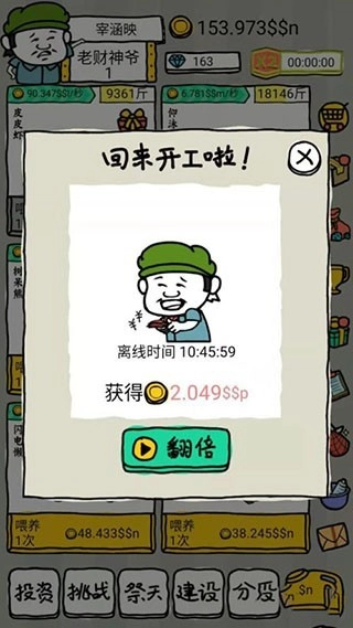 4、获取收益的主要方式是挂机,挂机一段时间后返回还能让收益翻倍。界面右上角设有收益翻倍的时长显示,单次时长为3小时。通过观看三次广告,最多可累计获得9小时的收益翻倍时间。