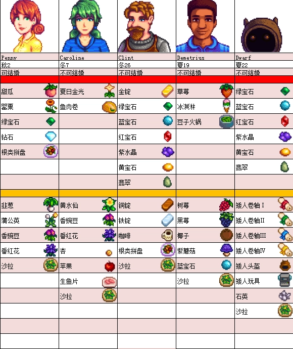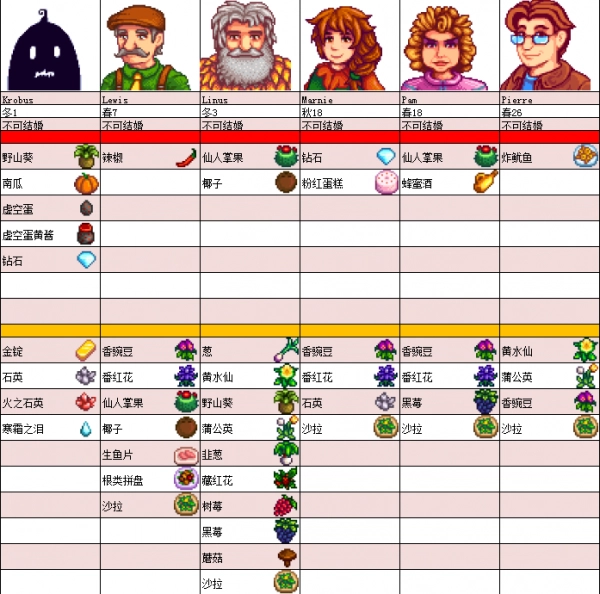 24、玛妮喜欢:钻石、粉红蛋糕、农夫午餐、南瓜派、五彩碎片、兔子的脚、珍珠、黄金南瓜、魔法糖冰棍。