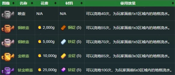 浇喷壶用于给作物浇水,能够装载各种类型的水,包括井水。如果一天没有浇水,农作物可能会生长缓慢或枯萎。