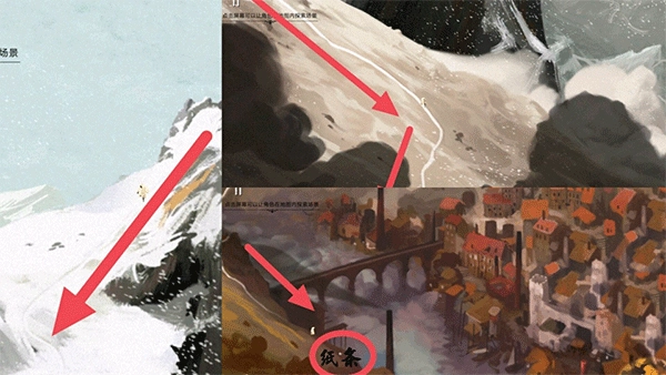 这一关没什么复杂的,你只要沿着山道一路往下走就行,途中会有不少蜿蜒转折的地方,算是专门让大家欣赏风景的福利章节。一直走到最后,等看到有张小纸条飞过来的时候,点击打开它,等剧情播放完,就能解锁下一个章节了。
