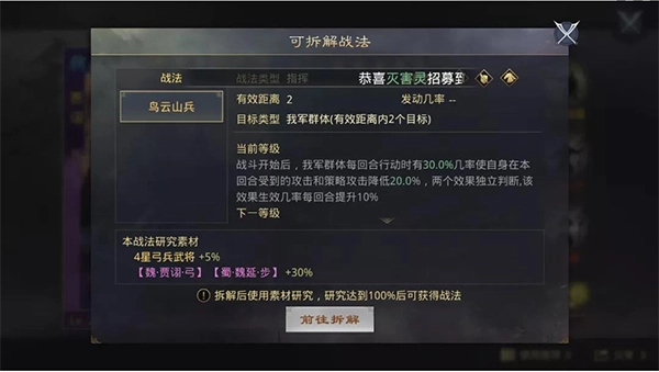 避其锋芒和鸟云山兵的作用目标未必完全重合,比如可能避其锋芒覆盖大营与中军,鸟云山兵则作用于中军和前锋;到了战斗的后五回合,队伍就能享受到鸟云山兵的效果,以此实现全程减伤。若没有鸟云山兵,玩家也可依据实际情况,用利兵谋胜、重整旗鼓、全军突击等战法来替代。