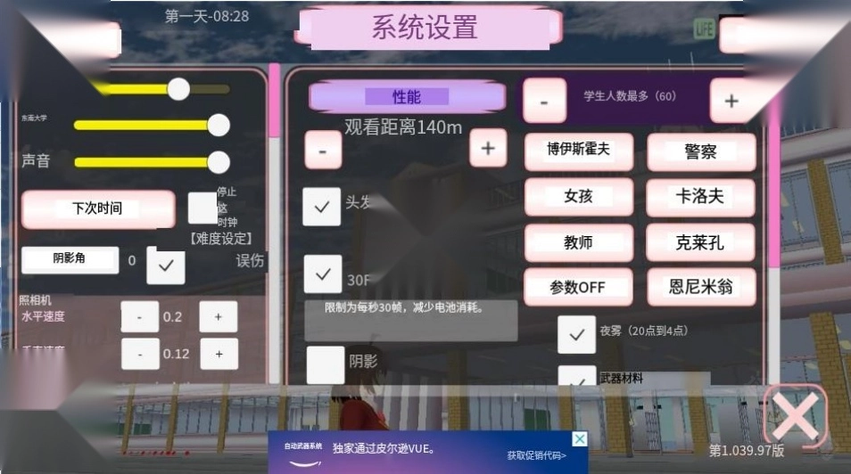 7、在游戏中还可以设置系统,比如学生数最多60人,观看距离140m等等之类的