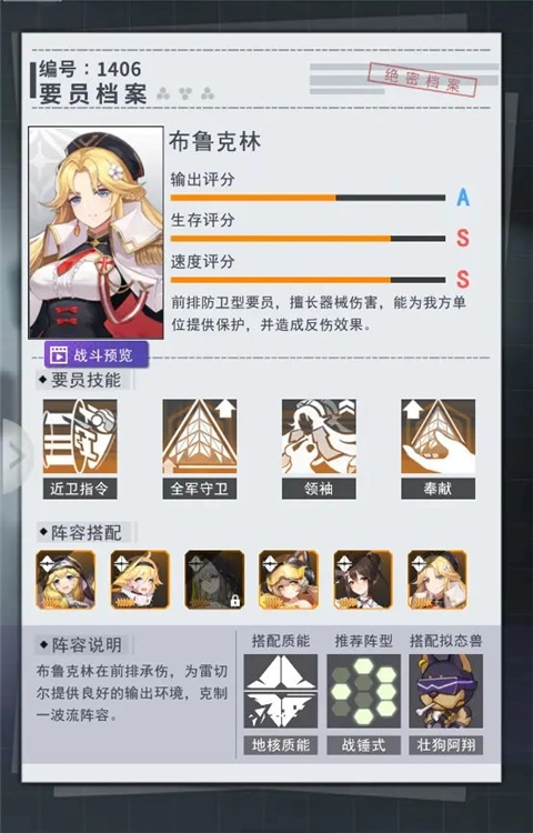 推荐理由:作为柯拉的上级、奈川的总指挥官,他善于依据战场态势灵活调整部队的防御布局。布鲁克林的一技能能够为生命值占比最低的友方单位提供庇护,替其分担50%的所受伤害;二技能则可向前中排全体单位施加基于布鲁克林自身最大生命值百分比的防护罩,有效增强前排的抗伤能力。即便布鲁克林退场,也会为我方生命值最低的单位释放等同于自身最大生命值的防护罩——哪怕只剩一人倒下,奈川的防线也绝不崩溃!