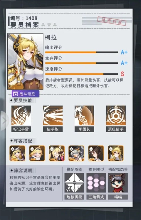 推荐理由:作为联盟政府的高级军官,柯拉时常亲临战场一线指挥作战。她的一技能是向前中排所有敌人投掷一枚标记手雷,不仅能造成能量伤害,还有概率为目标附加“猎标”效果——使其防御力降低。二技能则是召唤忠诚的机械猎犬投入战斗,对前中排随机敌人发起攻击并造成能量伤害。值得一提的是,若目标已处于“猎标”状态,柯拉的技能伤害还会得到额外加成。